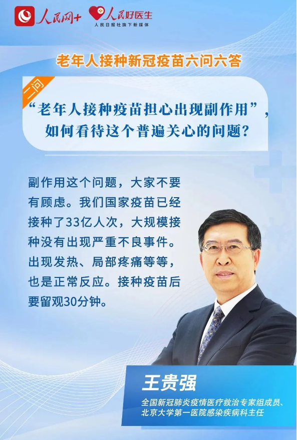 我国目前使用的新冠病毒疫苗,按照相关审批要求,在获得有关机构批准附条件上市或紧急使用前,均开展了包括老年人群在内的全人群的I、II、III期临床试验,显示疫苗具有良好的安全性和有效性。在各类疫苗中,我国主打的灭活和重组蛋白疫苗的副作用较低,例如接种后发热的比例为17.61/100万,一般不需要处理;严重过敏反应低于千万分之一,只要及时处理均无大碍。