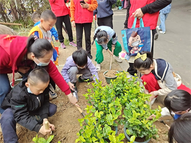 暖场环节结束后,参加活动的孩子们分组领取树苗,每人可领2至3株茉莉花苗,在志愿员的耐心讲解和示范指引下,在植树现场,大家纷纷拿起铁锹、锄头忙活了起来。落苗、填土、施肥、浇水,齐心协力共同种下茉莉花苗。